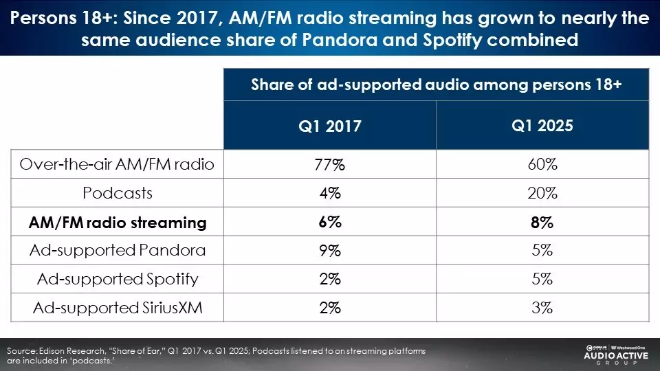 Edison’s “Share of Ear” study is the authoritative gold standard of American audio time use. Edison surveys 4,000 Americans annually to measure daily reach and time spent with all forms of audio. Significantly for advertisers, the “Share of Ear” platform permits analysis of ad-supported audio for media planning purposes. Here are five head snappers on AM/FM radio streaming from the just-released Q1 2025 study.